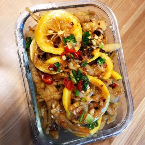 重点来了,秘制酱汁(白醋5勺、陈醋5勺、盐1勺、生抽3勺、香油1勺、蜂蜜2勺、白糖1勺、老干妈1勺)葱姜蒜末、百香果1个、柠檬一个切片、放入去骨的鸡爪、香菜切段、按摩均匀,即可享用啦!