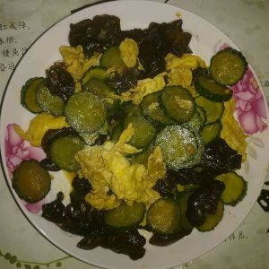 黄瓜木耳炒的差不多的时候放入煎好的鸡蛋,继续翻炒~依次放入盐,酱油。