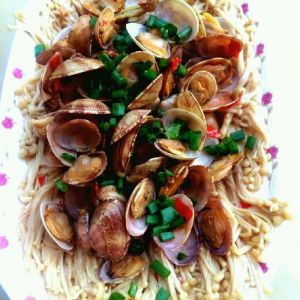 炒花蛤的时候,锅里会留有一些汤底,接着将金针菇倒入锅中烫熟,起锅装盘
