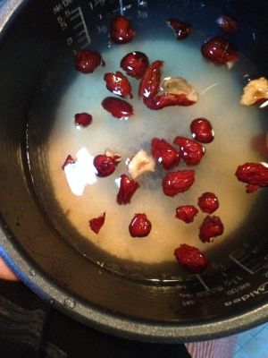 红枣洗净去核,将小米、红枣肉、水放入电饭煲中