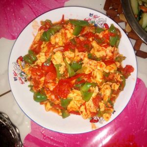 加入青椒,继续翻炒,加入适量盐至青椒变软