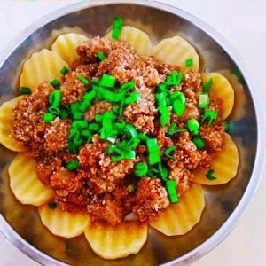 土豆去皮切片铺盘底,肉片放入姜、料酒、盐、生粉、生抽、老抽、糖、腐乳汁、拌匀,腌制30分钟,裹上蒸肉粉,铺在土豆盘中。