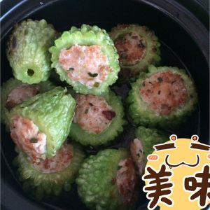 在平底锅里加油,将苦瓜有肉的两年煎至金黄,然后盛出到砂锅里,再撒上少许盐,这样苦瓜更入味!加入过半的水,小火烧20分钟就可以出锅了!记得帮它们翻翻身⊙∀⊙!