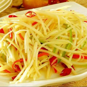 倒入土豆,翻炒几下,放盐,糖,白醋,大火快速翻炒,脆香出锅,别炒太久。