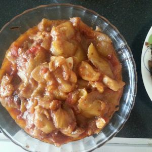 往锅内加少许油,放入适量葱姜蒜,和先前准备好的西红柿,把西红柿熬成汤,如果想吃甜的这时候可以再放点糖进去放入茄子。
