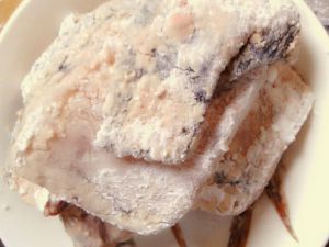 拿一个碗,倒入半碗番薯粉。把鲫鱼一片片的放入碗中,裹上粉。Tips:鲫鱼放入油锅前,重新裹上一层粉。这样炸出来的鱼才会比较酥脆。