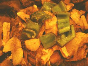 土豆片放入锅内炸熟捞出,再放入青椒过油后捞出。