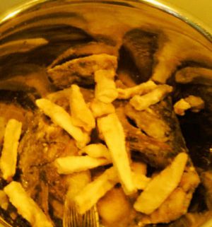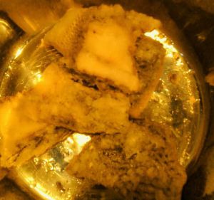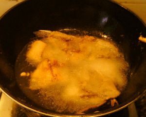 等到锅中油七成熟时,开中火,把鲫鱼片一块块放入锅中。炸制金黄色后捞出,把油继续加温后复炸鱼片。