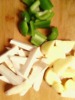 青椒、土豆切成块状,杏鲍菇横向对半切后,再切成条状。
