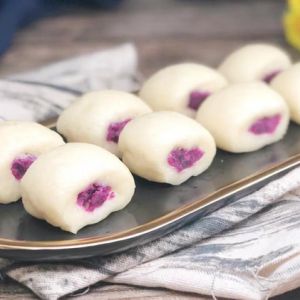 准备食材和工具:中筋面粉300克、紫薯泥150克、温水150克、酵母3克、白糖5克、炼乳20克