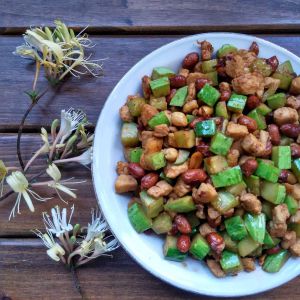 倒入切好的黄瓜,再倒入炒香的花生,把火关小