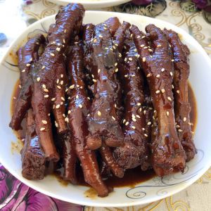 小火炒糖色,炒出糖色后放入鸡爪煎炸(全程小火)
