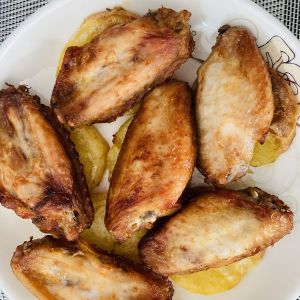 土豆切后片,上面摆鸡翅,上面放一片柠檬,空气炸锅180度,30分钟,中间翻个面