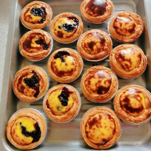 蛋挞皮不用解冻直接倒入蛋液即可,我做了两种口味的,一种是蛋液,一种是蓝莓味的,蓝莓我用的是自己做的蓝莓酱,先把蓝莓酱放到蛋挞皮即可。