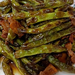 待四季豆煸出虎皮、变软后,下生抽、老抽、蠔油、盐调味,再翻炒几下(如果锅太干了,可以适量加一点点水)