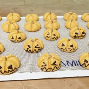 烤箱预热,150度烤30分钟,放凉后用溶化的巧克力画出鬼脸即可