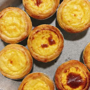 烤箱提前预热,200度10分钟。蛋挞皮在铺有硅油纸的烤盘中摆好,将蛋液倒入。