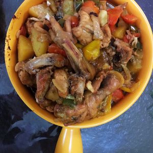 然后放油烧开,放冰糖化开放腌制的鸡肉,翻炒,在放胡萝卜,青椒,还有土豆翻炒,放酱油,蚝油,放水抹过鸡肉即可,然后盖好锅盖,开始弄面