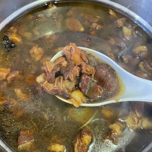 加入啤酒、开水、葱段、料酒、味极鲜酱油、调料包炖煮