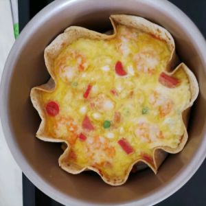 饼皮上刷一层番茄酱,在放一片芝士。然后将喜欢的蔬菜和火腿切粒,放入其中,铺上虾仁。最后倒入混合了20克牛奶的蛋液。