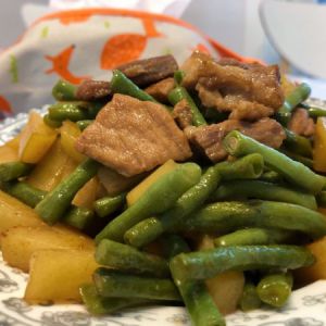 加入豆角和土豆,翻炒至豆角变深绿色。