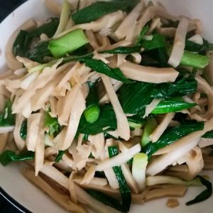紧接着下飞水后的面筋丝、藕丝,下入调味料