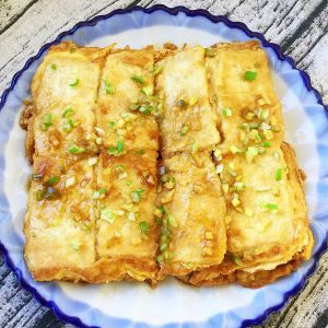 豆腐切长方片,均匀的抹上鸡肉馅,把另一半豆腐盖在肉馅上,豆腐块粘上玉米淀粉后,在将蛋黄糊均匀的涂抹上