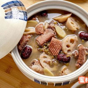 3.准备一口砂锅,放入清洗好的绿豆、赤小豆、排骨、莲藕、墨鱼干、墨鱼骨、姜片、2L清水,盖上盖子大火煮开后转小火炖煮1.5小时