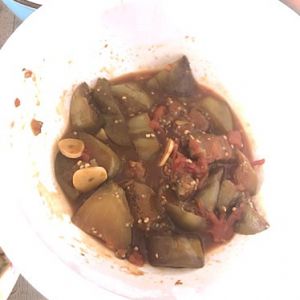放少许油,葱蒜爆香放西红柿放茄子翻炒淋汁,加适量开水,放少半勺盐,收汁