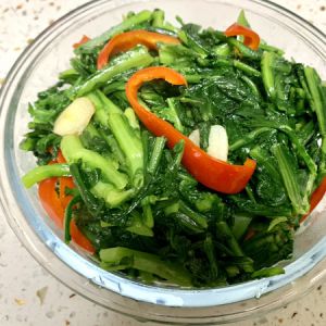 装盘、因为是给我们家李老师送饭、所以我直接装到玻璃盒子里了。这样、一道简简单单的茼蒿就做好了!