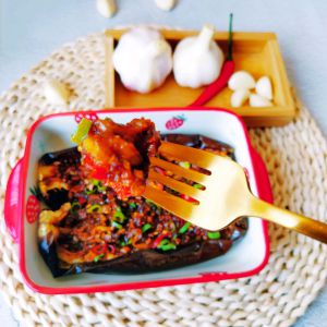 取出烤好的茄子表面撒少许小米辣碎和小香葱碎装饰一下,就可以享用美味的烤茄子了!