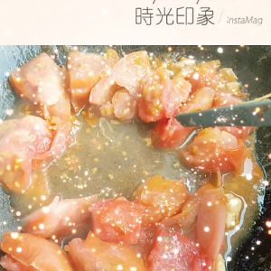 2.锅底放油爆热,放入葱蒜。把切好的西红柿放进翻炒,加入,鸡汤菌汤做成了高汤,熬煮.