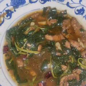 蔬菜炒制差不多熟了,加热水。再下腌制好的肉片(肉片下锅时需用筷子搅拌,防止粘粘在一起)