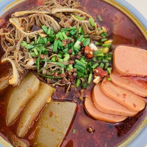 依次放入鸭血,方火腿,毛肚,毛肚煮30秒所有所有食材倒入锅里,表面撒葱花、干辣椒、香菜