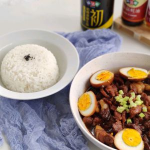 炖煮20分钟的时候,把熟鸡蛋剥壳加进去。