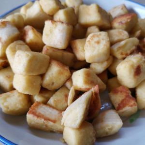 锅烧热后加入适量油,再倒入馒头块,中小火炒至金黄