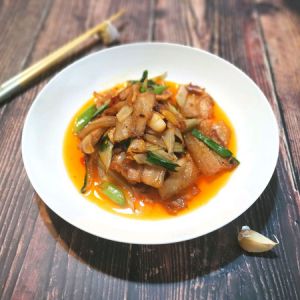 3.热锅下油(热锅凉油)。六成热,下五花肉爆炒