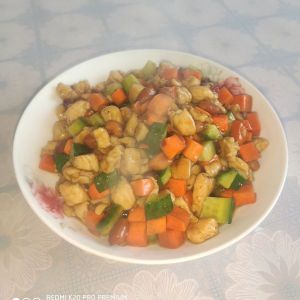 锅中放油,放入花椒,煸炒出香味后将花椒捞出,依次放入葱碎、蒜碎、干红辣椒碎、自制辣椒酱(或者郫县豆瓣)翻炒出香味后放入八成熟的鸡丁与胡萝卜继续翻炒1分钟。