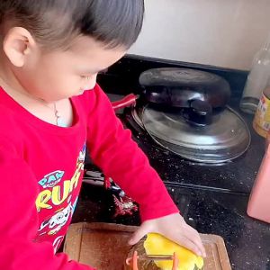 用牙签打交叉,打两个交错的叉,像南瓜一样就可以了,用枸杞作为南瓜丁