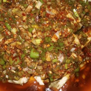 把烧好的油倒入切好的辣椒葱蒜里面,然后在导入生抽,花椒油盐鸡精,搅均匀,最后导入茄子上面,就可以了