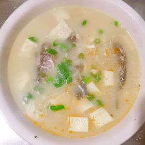 将鲫鱼移至锅边放入豆腐煎至变色,加入一满碗热水(汤碗)开大火煮沸!