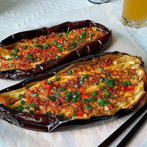 茄子烤到起皱,从中间破开,再划几刀方便入味