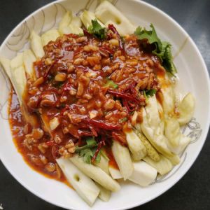 锅里加花生油,再放肉末翻炒,然后放辣椒丝蒜末继续翻炒,最后加少许水,烧开后浇上淀粉汁,盛出放到蒸熟的茄子上面即可食用了!