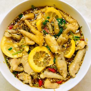 然后把冷却后的鸡爪捞出,放进调好的蘸料中,冰箱冷藏过夜。(最少也要6个小时)