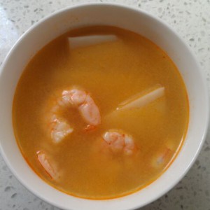 汤味道煮出来后,加入虾,椰粉加水调匀后煮5分钟左右;