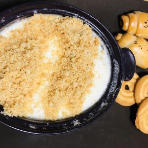 把奶倒入锅中煮熟 然后静置到温热备用