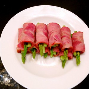 根据喜欢内馅多少,把培根切适当大小,把菜卷好!