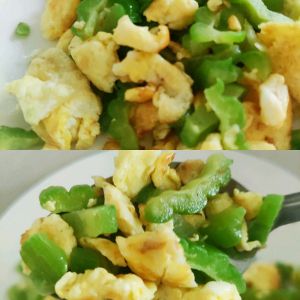 准备食材。苦瓜焯水(水里放点盐,会绿油油),蛋液里加盐打散。