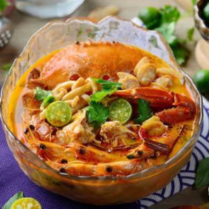 揭盖,放入椰浆50克、冬阴功酱50克、鱼露1汤匙、盐1/2茶匙、青柠片,再倒入600克水,合上锅盖,开始烹饪。