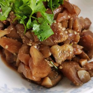 把茄子切好 少许油 翻炒加入适量盐然后加入水和老抽 少量耗油 在放入一颗大料